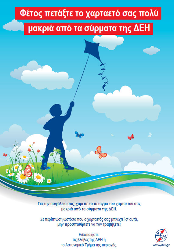 Η ΔΕΗ σας συμβουλεύει την Καθαρά Δευτέρα να μην πετάτε το χαρταετό σας κοντά σε ηλεκτρικά σύρματα, καθώς υπάρχει σοβαρός κίνδυνος ηλεκτροπληξίας για σας και διακοπής της παροχής ρεύματος στη γύρω περιοχή.