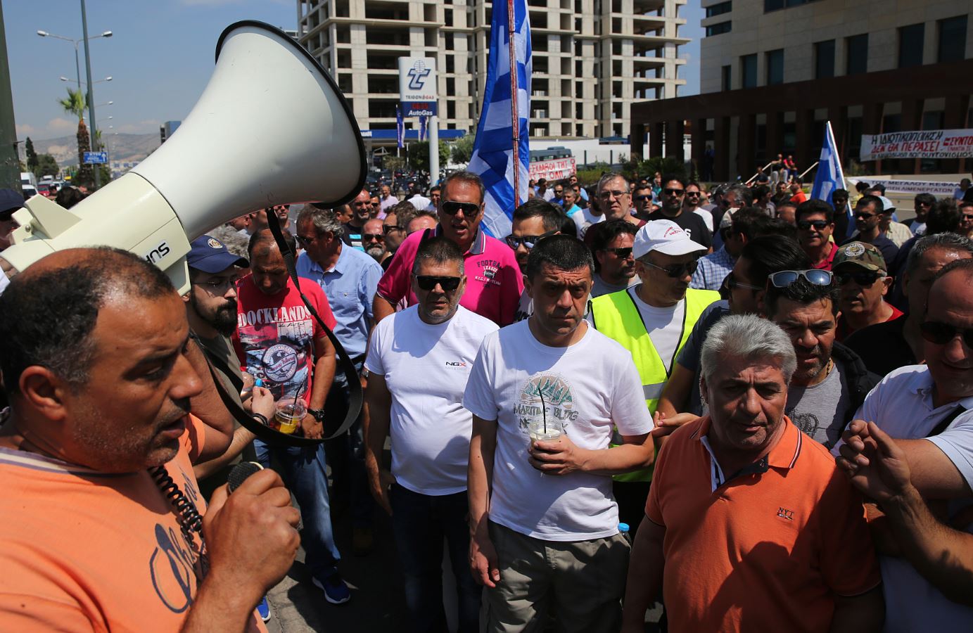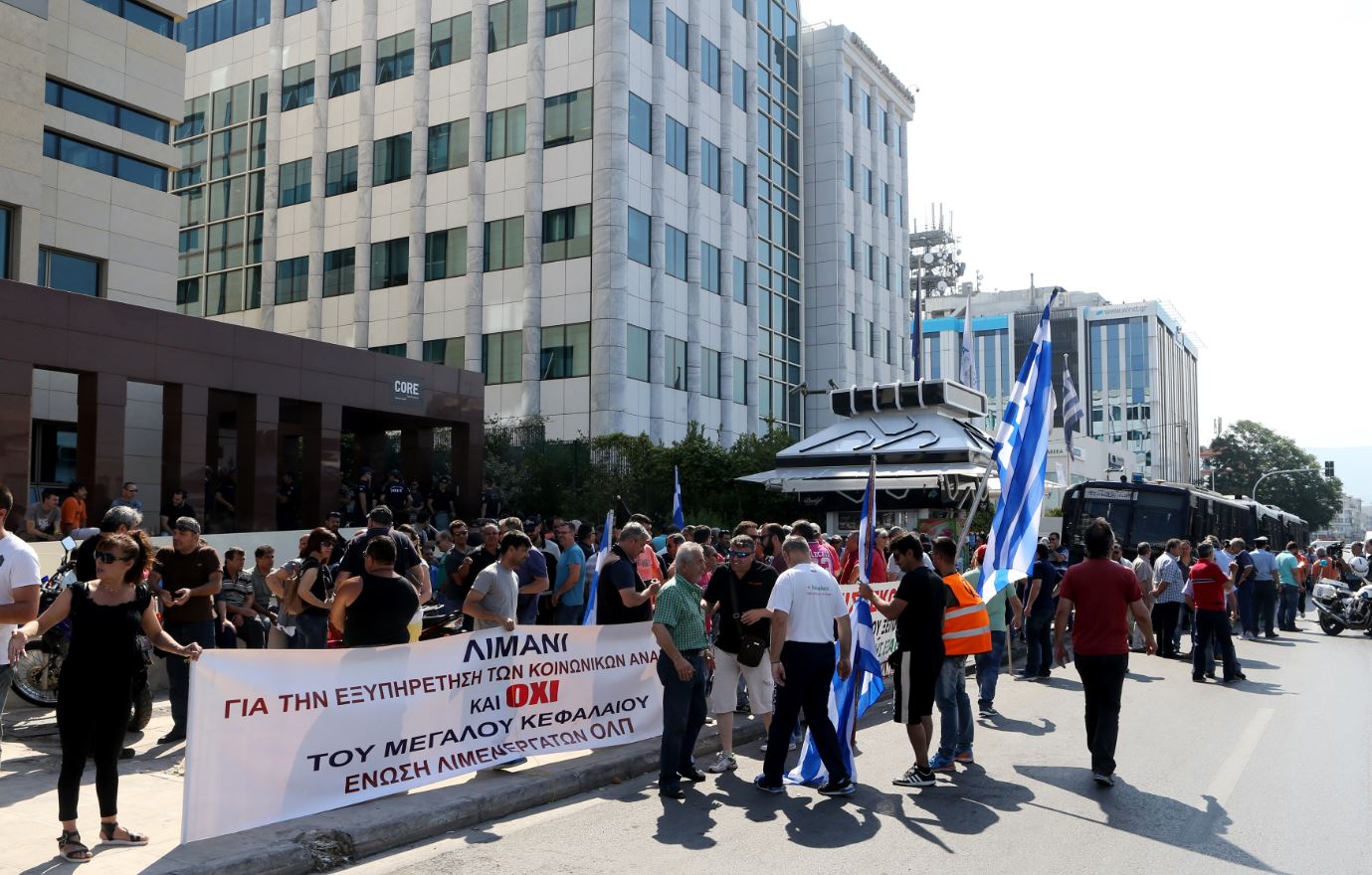 Εργαζόμενοι στα λιμάνια του Πειραιά και της Θεσσαλονίκης συγκεντρώθηκαν έξω από το Χρηματιστήριο Αθηνών, όπου πραγματοποιήθηκε η γενική συνέλευση των μετόχων του ΟΛΠ, ώστε να προχωρήσει η διαδικασία πώλησης των μετοχών του λιμανιού του Πειραιά από το ΤΑΙΠΕΔ στην Cosco.
