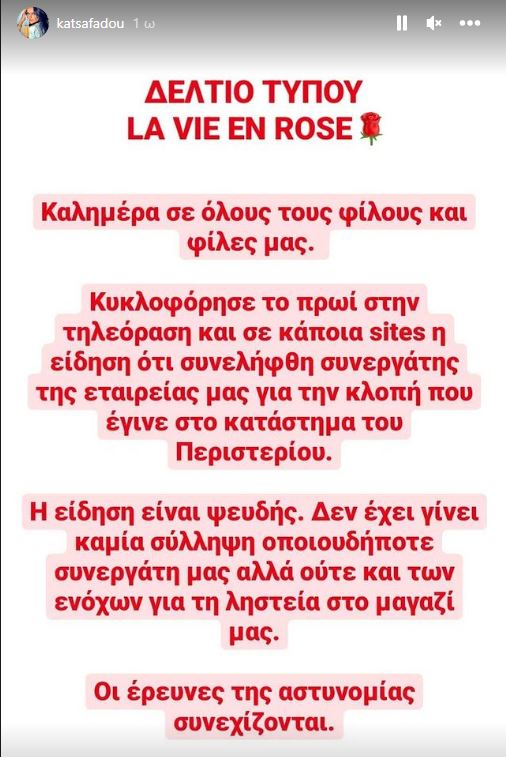 «Δεν έχει γίνει καμία σύλληψη οποιουδήποτε συνεργάτη μας αλλά ούτε και των ενόχων για τη ληστεία στο μαγαζί μας. Οι έρευνες της αστυνομίας συνεχίζονται» αναφέρεται μεταξύ άλλων στην ανάρτηση.