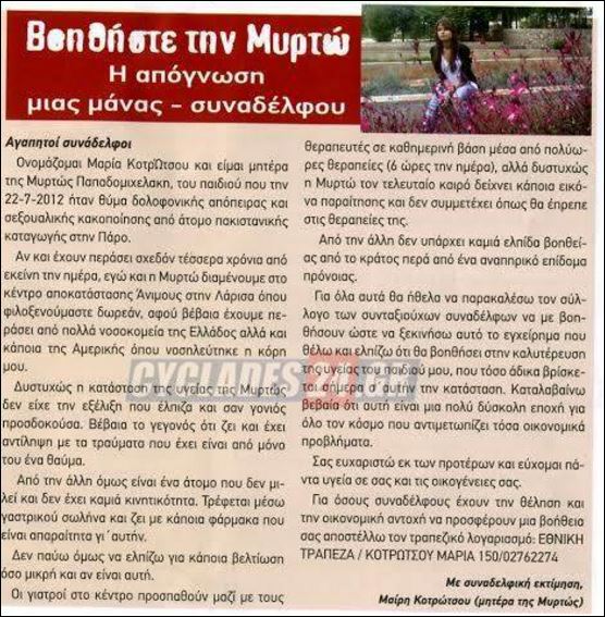 Το cyclades24.gr δημοσιεύει την επιστολή που στέλνει στους πρώην συναδέλφους της με τίτλο «Βοηθήστε τη Μυρτώ».