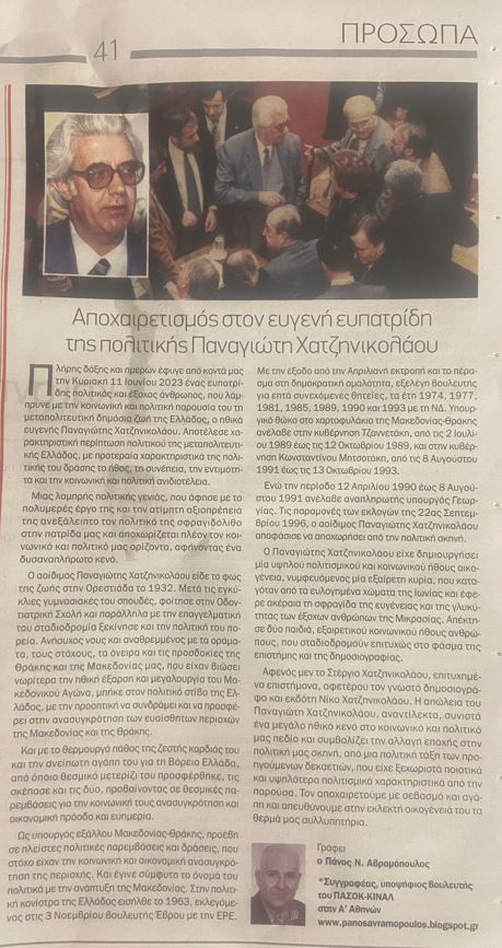 Αποχαιρετισμό στον «ευγενή ευπατρίδη της πολιτικής Παναγιώτη Χατζηνικολάου», δημοσιεύει η εφημερίδα «Παρασκήνιο». Το κείμενο, που υπογράφει ο συγγραφέας-υποψήφιος βουλευτής του ΠΑΣΟΚ-ΚΙΝΑΛ, Πάνος Ν. Αβραμόπουλος, παρουσιάζει την πολιτική διαδρομή του Παναγιώτη Χατζηνικολάου, σε μια κρίσιμη περίοδο της Ελλάδας, πριν και μετά την Μεταπολίτευση, καθώς και τα πολιτικά του οράματα. Τονίζει ιδιαίτερα τις ηθικές αξίες του αοίδιμου Παναγιώτη Χατζηνικολάου, αλλά και την κοινωνική του παρουσία.