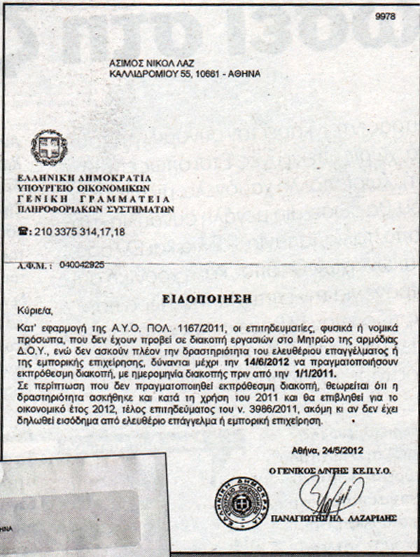 Δεν τα είχαμε δει όλα από την εφορία όπως φαίνεται. Το υπουργείο οικονομικών θυμήθηκε τον διάσημο αυτόχειρα καλλιτέχνη και του έστειλε ειδοποίηση να τακτοποιήσει τις εκρεμμότητές του διότι “αν δεν έχει διακόψει τις εργασίες του ως ελεύθερου επαγγελματία,θα θεωρηθεί οτι άσκησε τη δραστηριότητά του και για το 2011 και θα πρέπει να καταβάλει το τέλος επιτηδευματία. Το απίστευτο αυτό θέμα φέρνει σήμερα στη δημοσιότητα “Το Ποντίκι”.