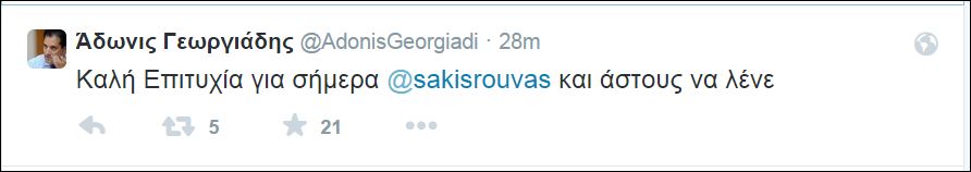 «Καλή Επιτυχία για σήμερα @sakisrouvas και ασ’ τους να λένε» έγραψε χαρακτηριστικά, ο κ. Γεωργιάδης στον προσωπικό του λογαρισμό στο twitter.