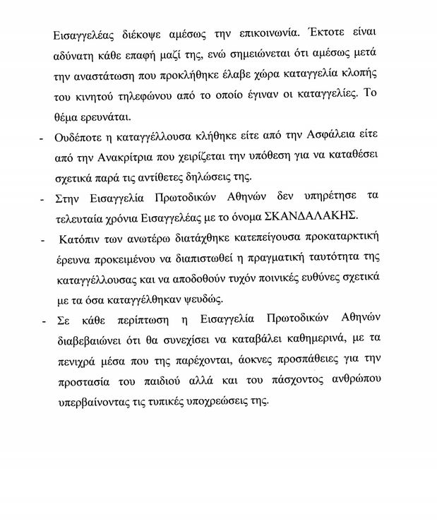 Η Εισαγγελία διέψευσε ότι υπάρχει φάκελος για την οικογένεια του παιδιού στον ΟΚΑΝΑ, τονίζοντας ότι ο Οργανισμός δεν διαθέτει ψυχίατρο με το όνομα Μαρία Καλογεροπούλου, ούτε υπάρχει εισαγγελέας με το επίθετο Σκανδαλάκης -όπως επικαλέστηκε η γυναίκα στους τηλεοπτικούς σταθμούς.