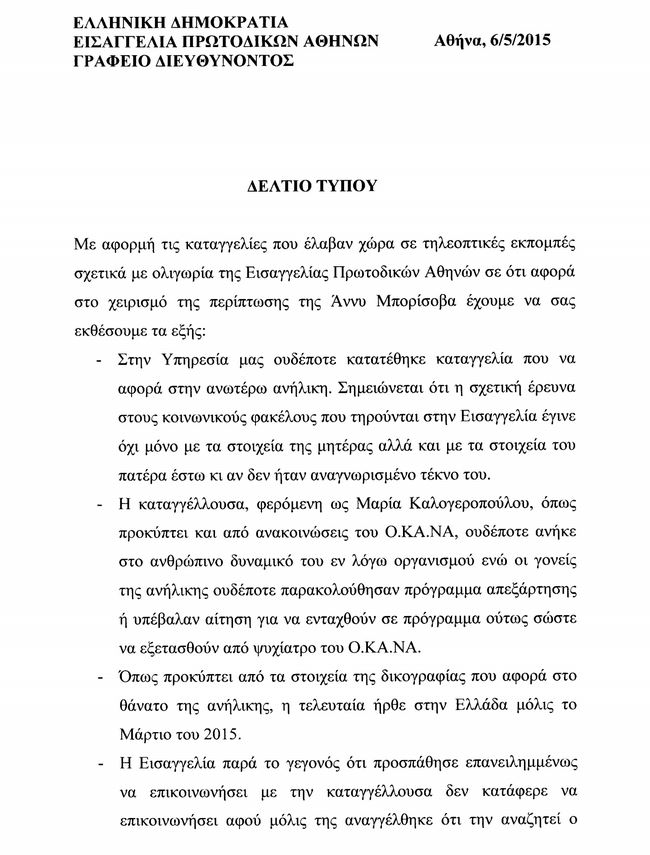 Μετά και τον ΟΚΑΝΑ και η Εισαγγελία Αθηνών εξέδωσε ανακοίνωση για την υπόθεση της 4χρονης Αννυ και όσα ειπώθηκαν νωρίτερα σήμερα σε τηλεοπτική εκπομπή.