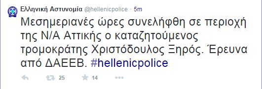 Στο μήνυμά της η ΕΛ.ΑΣ. αναφέρει: «Μεσημεριανές ώρες συνελήφθη σε περιοχή της Ν/Α Αττικής ο καταζητούμενος τρομοκράτης Χριστόδουλος Ξηρός. Έρευνα από ΔΑΕΕΒ».