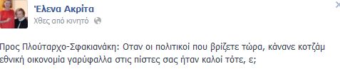 “Προς Πλούταρχο-Σφακιανάκη: Όταν οι πολιτικοί που βρίζετε τώρα, κάνανε κοτζάμ εθνική οικονομία γαρύφαλλα στις πίστες σας ήταν καλοί τότε, ε;”, ήταν το σχόλιο της γνωστής δημοσιογράφου.