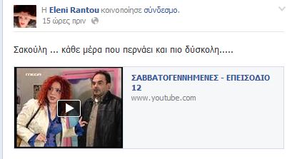 «Σακούλη … κάθε μέρα που περνάει και πιο δύσκολη…..», έγραψε η Ελένη Ράντου, που ανέβασε στην σελίδα ένα επεισόδιο από τις Σαββατογεννημένες, στις οποίες είχε πρωταγωνιστήσει μαζί με τον Σάκη Μπουλά.