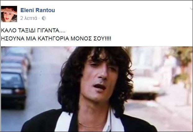 Με ένα λιτό σχόλιο στην προσωπική της σελίδα στο Facebook αποχαιρέτησε η Ελένη Ράντου τον Στάθη Ψάλτη, ο οποίος πέθανε σήμερα σε ηλικία 66 ετών μετά από σκληρή μάχη με τον καρκίνο.«Καλό ταξίδι γίγαντα… Ήσουνα μια κατηγορία μόνος σου!!!!», έγραψε η δημοφιλής ηθοποιός.
