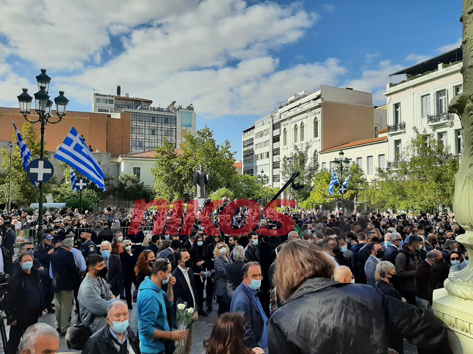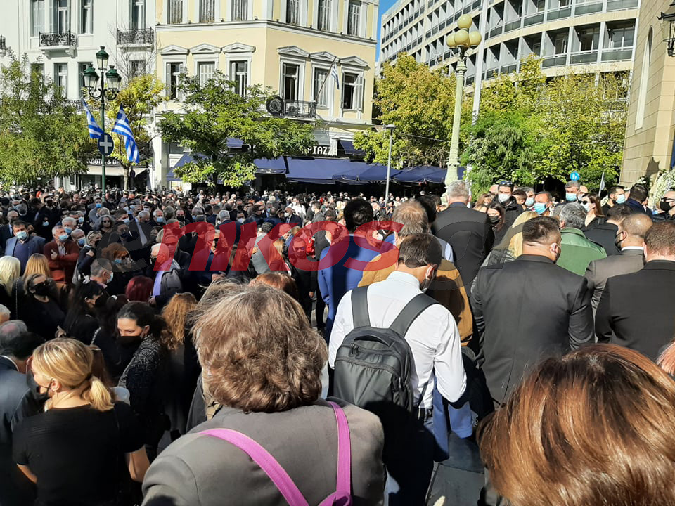 Με λίγα λουλούδια στα χέρια και με δάκρυα στα μάτια, πολίτες της Αθήνας αλλά και από άλλες περιοχές της Ελλάδας φτάνουν στο παρεκκλήσι της Μητρόπολης Αθηνών όπου βρίσκεται το φέρετρο πάνω στο οποίο ξεχωρίζουν οι τρεις σημαίες: Η γαλανόλευκη, του ΠΑΣΟΚ και του ΚΙΝΑΛ.