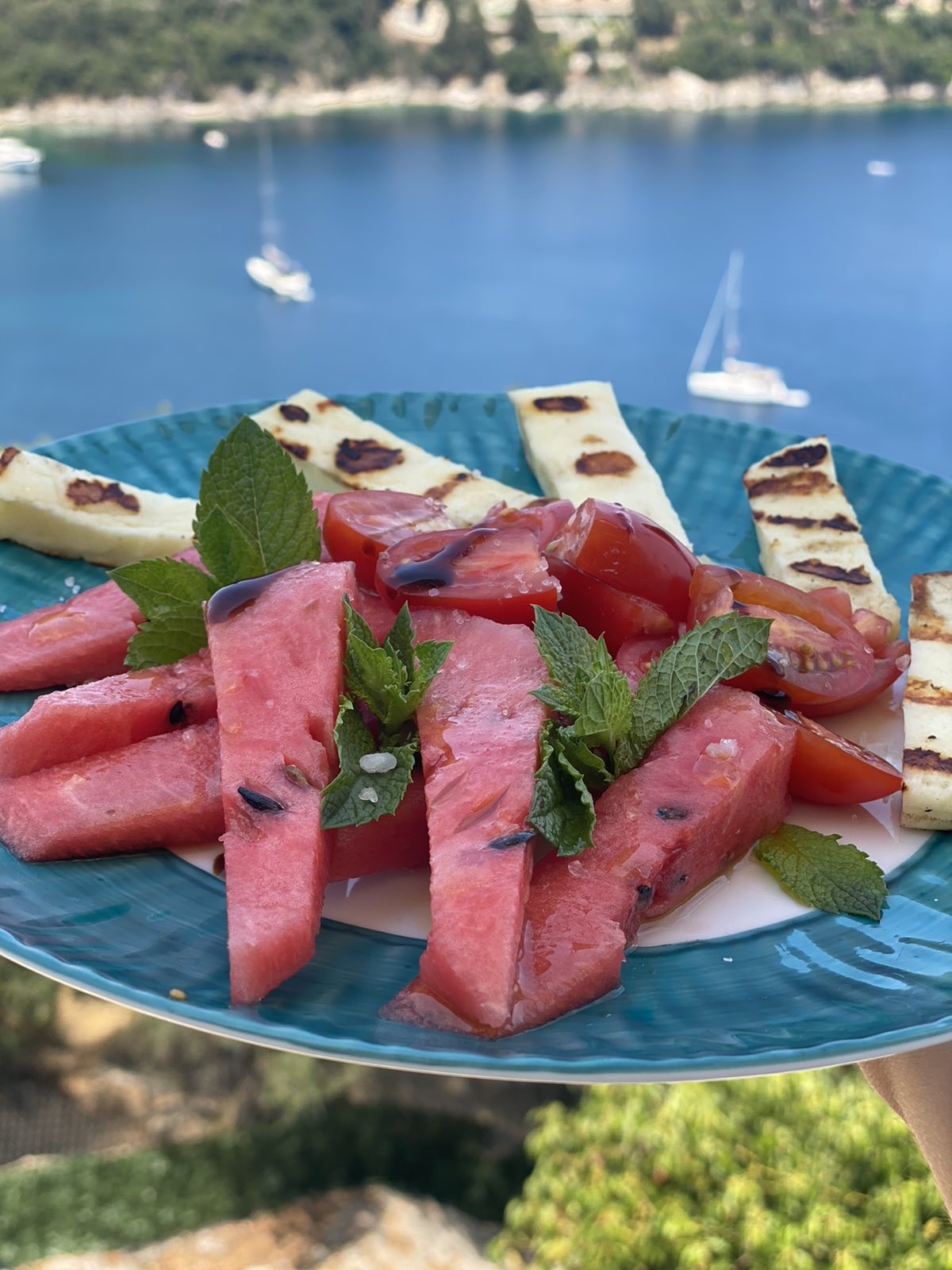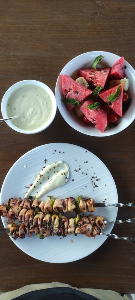 «Μαγειρέψαμε ένα κοντοσούβλι καλαμάρι, το οποίο είχε προετοιμαστεί σε μία ενδιαφέρουσα μαρινάδα με φρέσκο τζίντζερ, χυμό και ξύσμα από λεμόνι, ελαιόλαδο και τσίλι και το συνοδεύσαμε με μία σάλτσα αγιολί, δηλαδή μια μαγιονέζα με σκόρδο που φτιάχνουν συνήθως στα Επτάνησα και τη Δυτική Ελλάδα», εξηγεί η meat & fire chef Μυρσίνη Λαμπράκη, η οποία εμπνεύστηκε το πιάτο. «Συνοδεύσαμε το κοντοσούβλι καλαμάρι με μία σαλάτα, όπου συνδυάσαμε καρπούζι, ντομάτα, δυόσμο, ελαιόλαδο και ψητό χαλούμι», συμπληρώνει το δεύτερο μέλος της ελληνικής αποστολής, Αλέξανδρος Πράντζος.