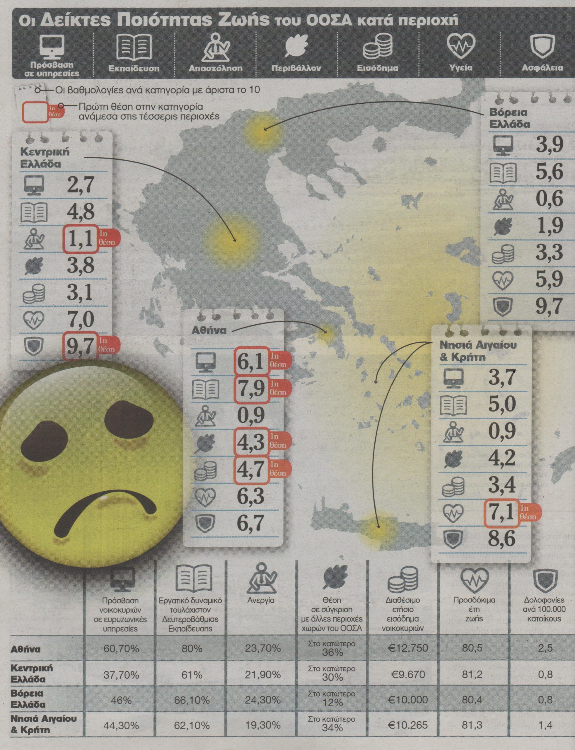 Τα στοιχεία αφορούν τον Δείκτη Ποιότητας Ζωής σε επιλεγμένες περιοχές των 34 χωρών-μελών του. Ο ΟΟΣΑ παρουσίασε χθες νέο διαδραστικό ιστότοπο (http://www.oecdregionalwellbeing.org/), όπου μπορεί κανείς να δει πως διαμορφώνονται οι συγκεκριμένοι οκτώ παράγοντες που επηρεάζουν την ποιότητα ζωής στον τόπο διαμονής του επιτρέποντας τη σύγκριση και με άλλες περιοχές.