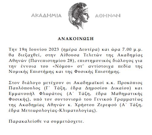 Πρόσκληση συμμετοχής στον επιστημονικό διάλογο για την έννοια του «Νόμου» στα αντίστοιχα πεδία της Νομικής Επιστήμης και της Φυσικής Επιστήμης, απευθύνει η Ακαδημία Αθηνών.
