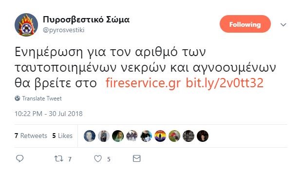 Οι αγνοούμενοι, υπολογιζόμενοι με βάση την υποβολή επισήμων δηλώσεων από τα οικεία τους πρόσωπα, ανέρχονται σε 14 άτομα.Δείτε το tweet της Πυροσβεστικής: