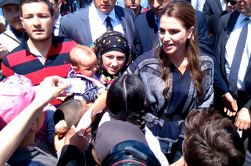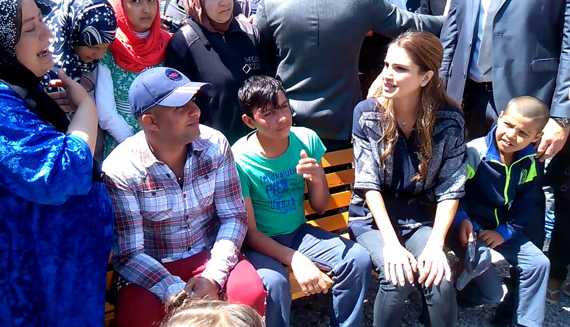 Όπως φαίνεται και στις φωτογραφίες, η βασίλισσα Ράνια, κατά τη διάρκεια της επίσκεψής της στον καταυλισμό, κάθισε με τους πρόσφυγες και συνομίλησε μαζί τους.