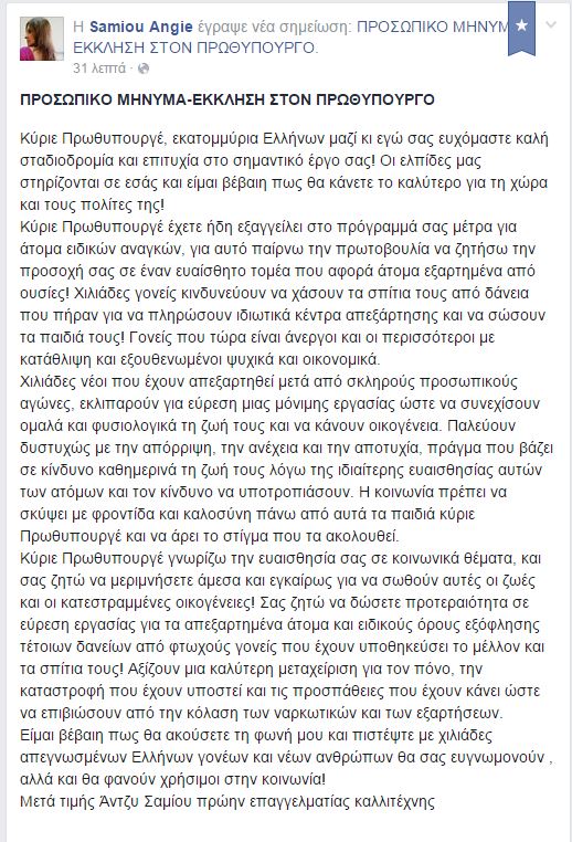 H Άντζυ Σαμίου μέσω facebook ζητά από τον Πρωθυπουργό Αλέξη Τσίπρα να δώσει βάρος σε άτομα εξαρτημένα από ουσίες και του εύχεται καλή επιτυχία.