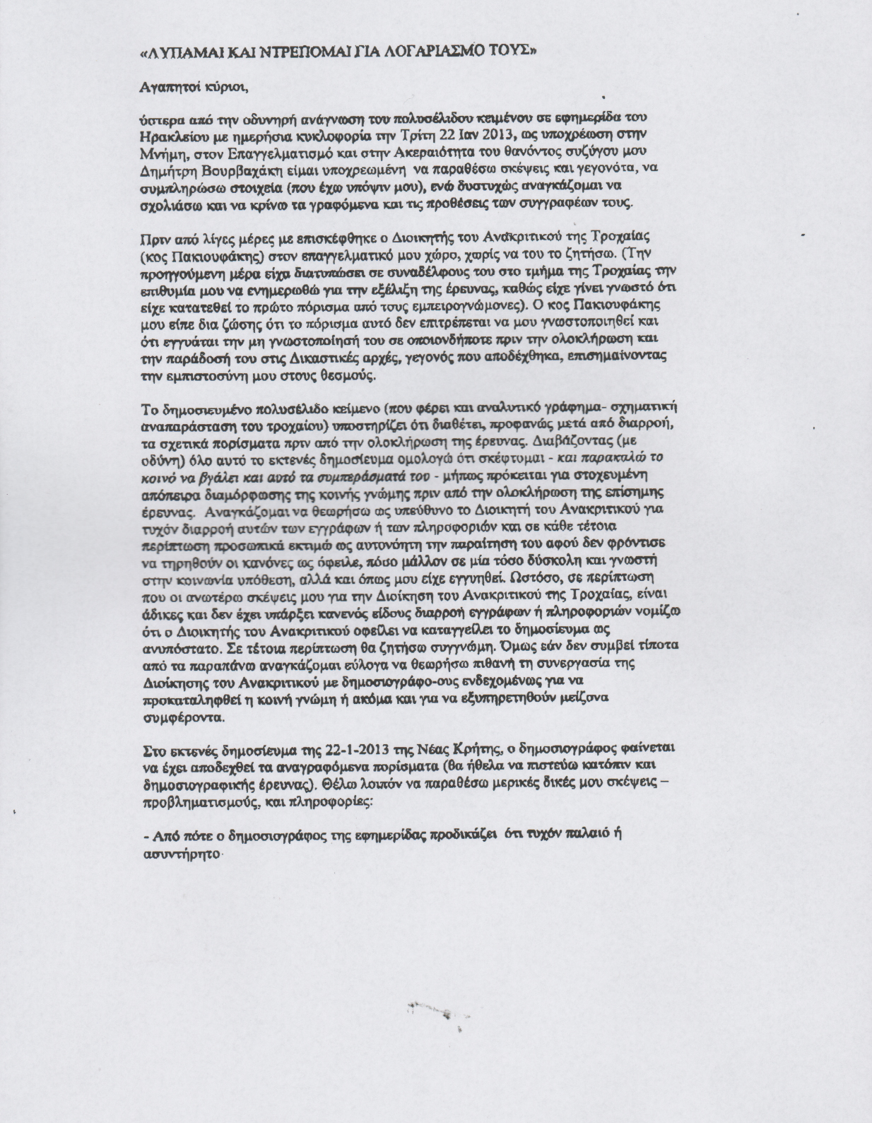 Η γιατρός Ελένη Αποστολάκη-Βουρβαχάκη,στην επιστολή της “σπάει” τη σιωπή της για πρώτη φορά μετά το τραγικό δυστύχημα, και εξαπολύει δριμύ “κατηγορώ” για τη διαρροή των πορισμάτων των ειδικών εμπειρογνωμόνων για την τραγωδία που βύθισε στο πένθος ολόκληρη την κοινωνία της Κρήτης.