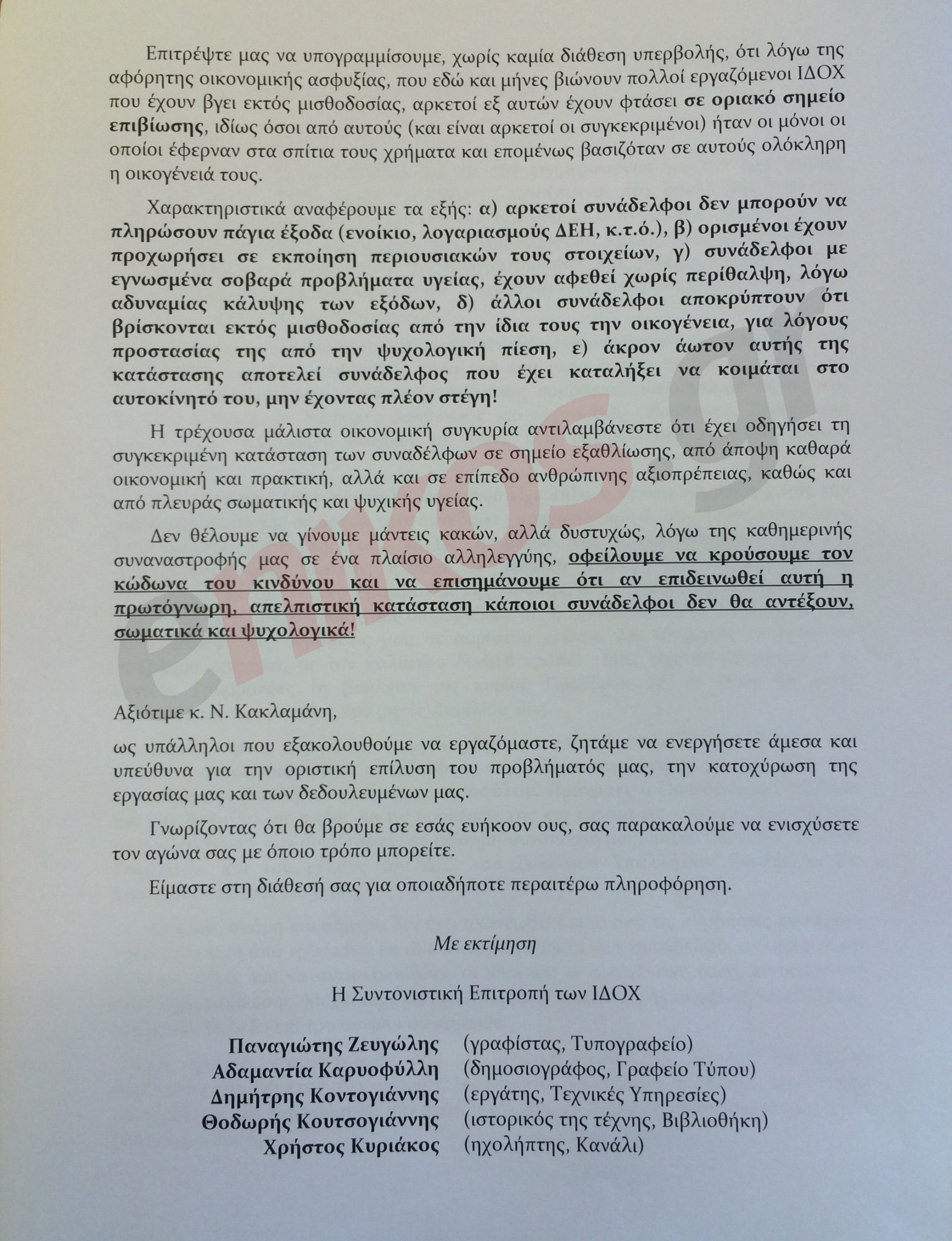 «Οι σχετικές διαβεβαιώσεις από τη θεσμική ηγεσία της Βουλής, για άμεση διευθέτηση του θέματος, δεν έχουν τελεσφορήσει. Το βιοτικό πρόβλημα είναι πλέον ανυπέρβλητο και διογκούμενο, αλλά και η αγωνία, το άγχος, η ανασφάλειά μας έχουν ξεπεράσει κάθε όριο».