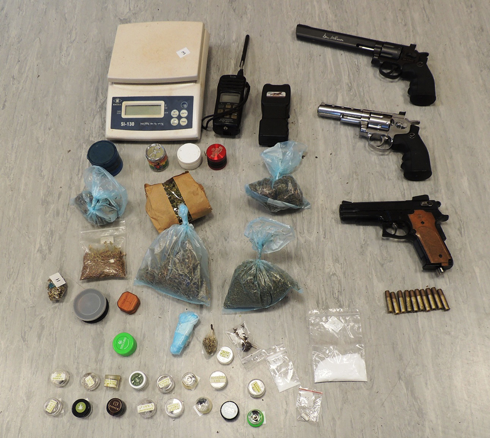 Έπειτα από έρευνα που διενεργήθηκε στο σπίτι του, στην Καλλιθέα, βρέθηκαν και κατασχέθηκαν, μεταξύ άλλων, 160,7 γραμμάρια κάνναβης, 0,9 γραμμάρια κοκαΐνης, 2,4 γραμμάρια άγνωστης ουσίας, 2 αεροβόλα περίστροφα, αεροβόλο πιστόλι, συσκευή ηλεκτρικής εκκένωσης (taser), φορητός ασύρματος και 2 Δελτία Αστυνομικής Ταυτότητας για τα οποία είχε δηλωθεί απώλεια.