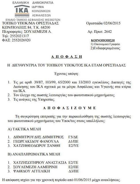 Στο υποκατάστημα του ΙΚΑ Ορεστιάδας ορίστηκε εξαμελής επιτροπή υπαλλήλων για να παρακολουθούν αν λειτουργεί σωστά το φωτοτυπικό μηχάνημα.