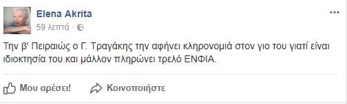 Έτσι η Έλενα Ακρίτα στην ανάρτησή της στο προφίλ της στο Facebook ανέφερε: “Την β’ Πειραιώς ο Γ. Τραγάκης την αφήνει κληρονομιά στον γιο του γιατί είναι ιδιοκτησία του και μάλλον πληρώνει τρελό ΕΝΦΙΑ.”