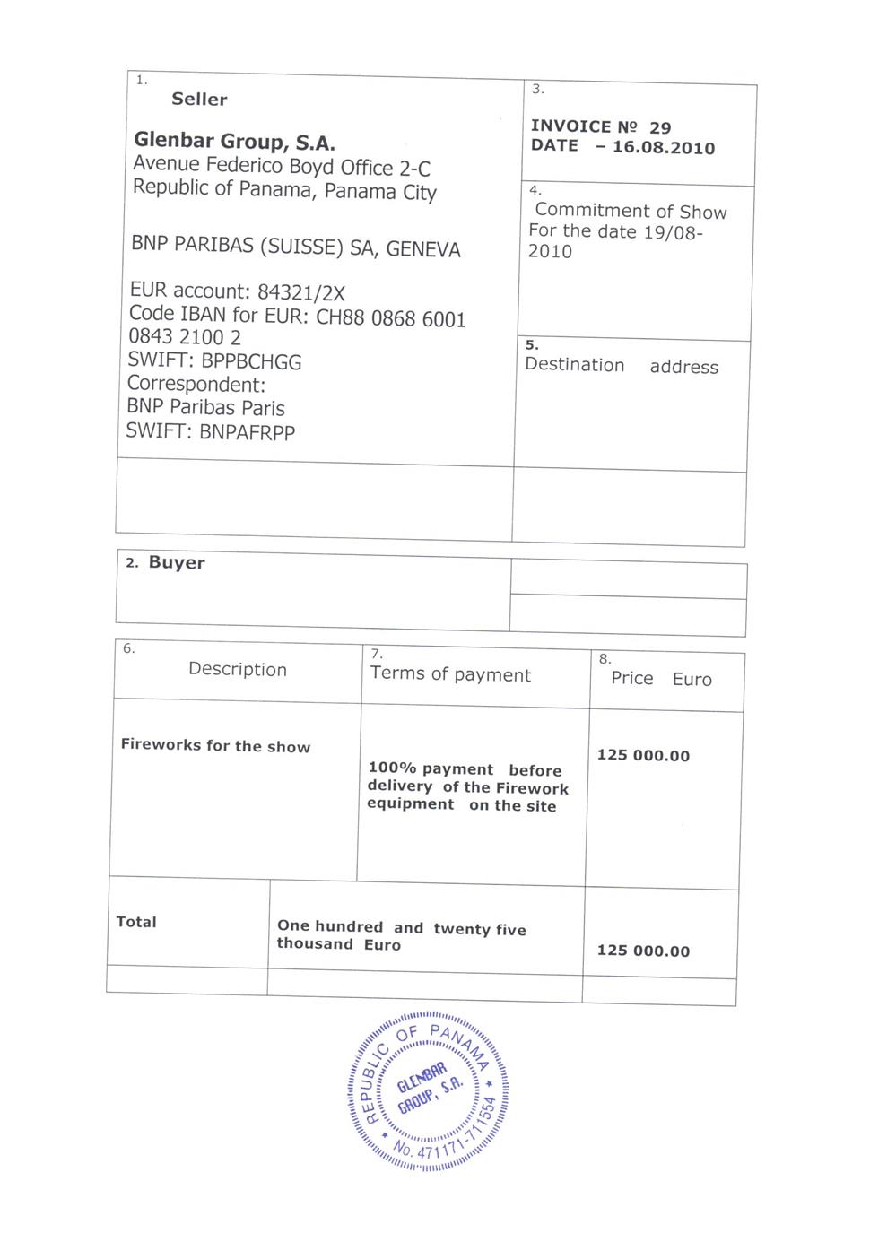 Σε έγγραφο επισυναπτόμενο σε μήνυμα από την εκπρόσωπο της εταιρείας προς μέλος της οικογένειας των ολιγαρχών, και με τη σημείωση ότι η πληρωμή πρέπει να καταβληθεί πριν από την παράδοση των πυροτεχνημάτων στο χώρο, επιβεβαιώνεται ότι το κόστος τους όντως ανέρχονταν σε 125.000 ευρώ. Αν και η εκπρόσωπος της εταιρείας ήταν Ρωσίδα και το τηλέφωνο επικοινωνίας ρωσικό, η εταιρεία που εξέδωσε το τιμολόγιο για τα πυροτεχνήματα εμφανίζεται να έχει έδρα στον Παναμά. Η ίδια παναμέζικη εταιρεία είναι αυτή που εκδίδει τα παραστατικά για τον εξοπλισμό όσον αφορά το “υδάτινο” μέρος των highlights του πάρτι.