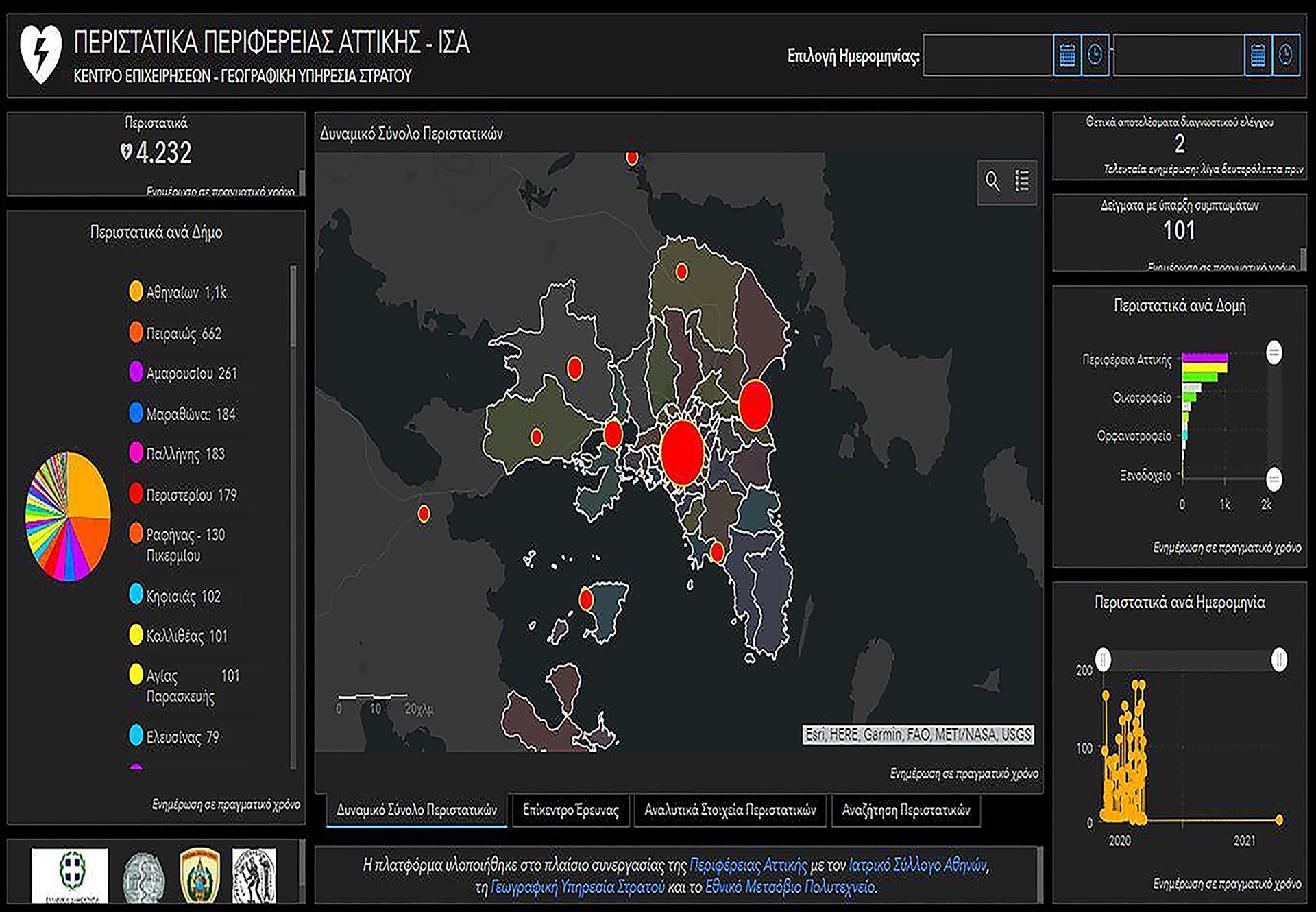 - Ανάπτυξη γεωχωρικού συστήματος καταγραφής και παρακολούθησης περιστατικών COVID – 19 σε συνεργασία με τον Ιατρικό Σύλλογο Αθηνών και την Περιφέρεια Αττικής.