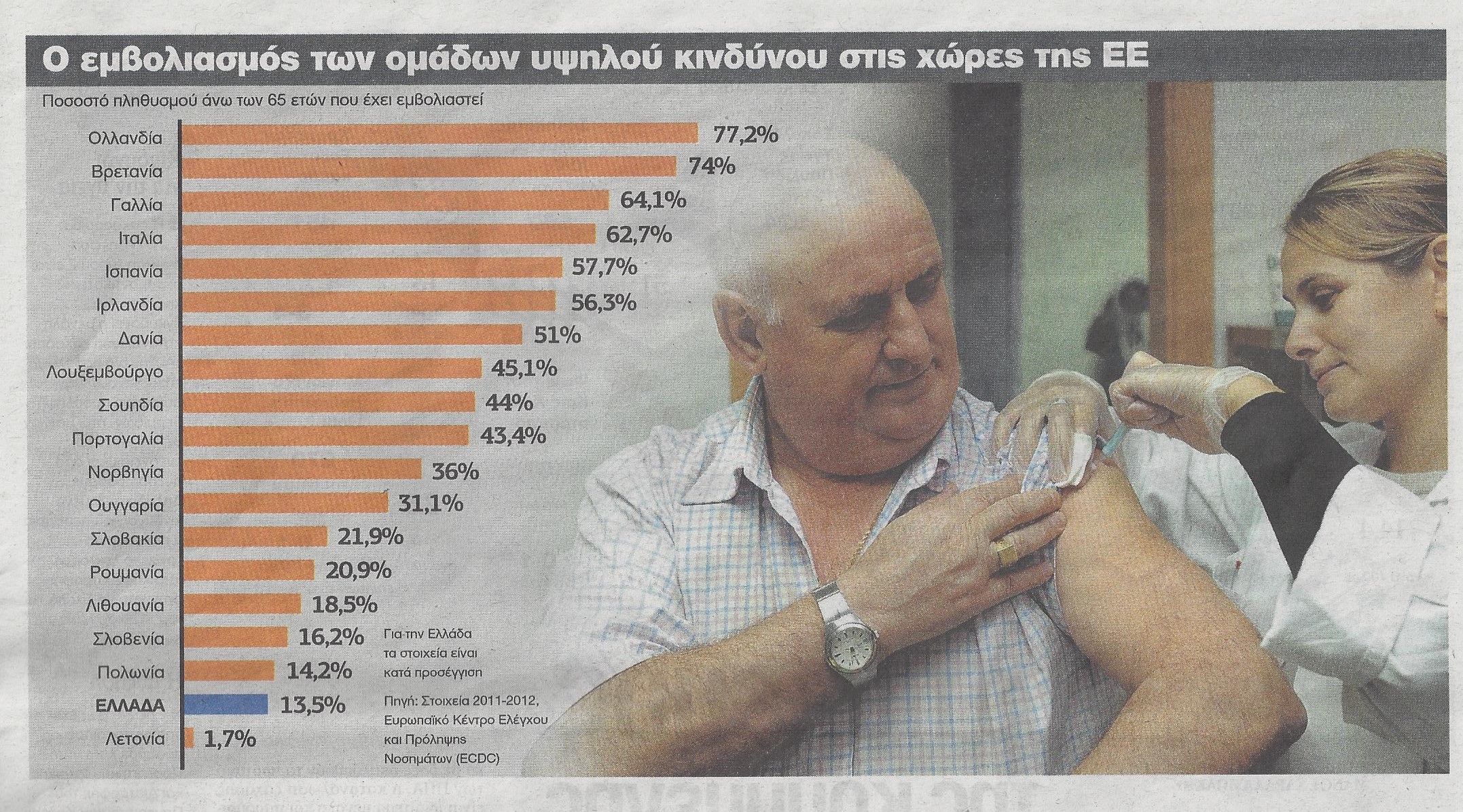 Η Ελλάδα είναι από τις λίγες χώρες που δεν συμμετείχε φέτος στην κεντρική ευρωπαϊκή μελέτη για τον εμβολιασμό (καθυστέρησε, τώρα συντάσσεται η έκθεση), ενώ σύμφωνα με στοιχεία του Κέντρου Ελέγχου και Πρόληψης Νοσημάτων (ΚΕΕΛΠΝΟ) μόνο το 13,5% των ατόμων υψηλού κινδύνου έχουν εμβολιαστεί. Πρόταση της αρμόδιας ευρωπαϊκής Αρχής είναι να εμβολιαστεί το 75% των ατόμων που ανήκουν σε ομάδες υψηλού κινδύνου, κάτι που πέτυχε μόνο η Ολλανδία.