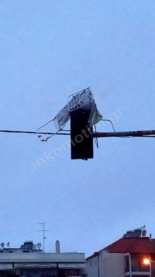 Αρκετές φορές έχουμε δει διάφορα αντικείμενα, όπως κάδους απορριμμάτων, πινακίδες, κ.λπ., να έχουν παρασυρθεί από τους δυνατούς άνεμους.Όμως αυτή η εικόνα σίγουρα δεν συναντάται συχνά: μια απλώστρα στην οποία μάλιστα υπήρχαν κρεμασμένα ρούχα, «απογειώθηκε» από κάποια βεράντα, και «προσγειώθηκε» σε κολόνα φωτεινού σηματοδότη στον κόμβο του ΙΚΑ, στην πόλη της Κομοτηνής. Συνεργείο του Δήμου έχει κινητοποιηθεί για… το κατέβασμα της «ιπτάμενης απλώστρας».