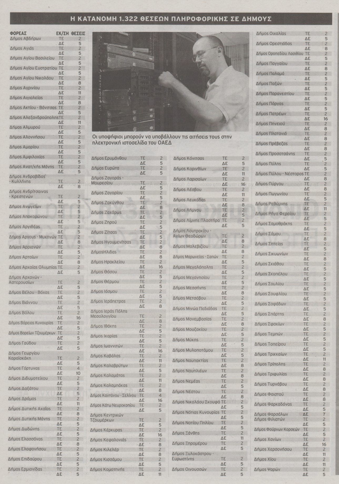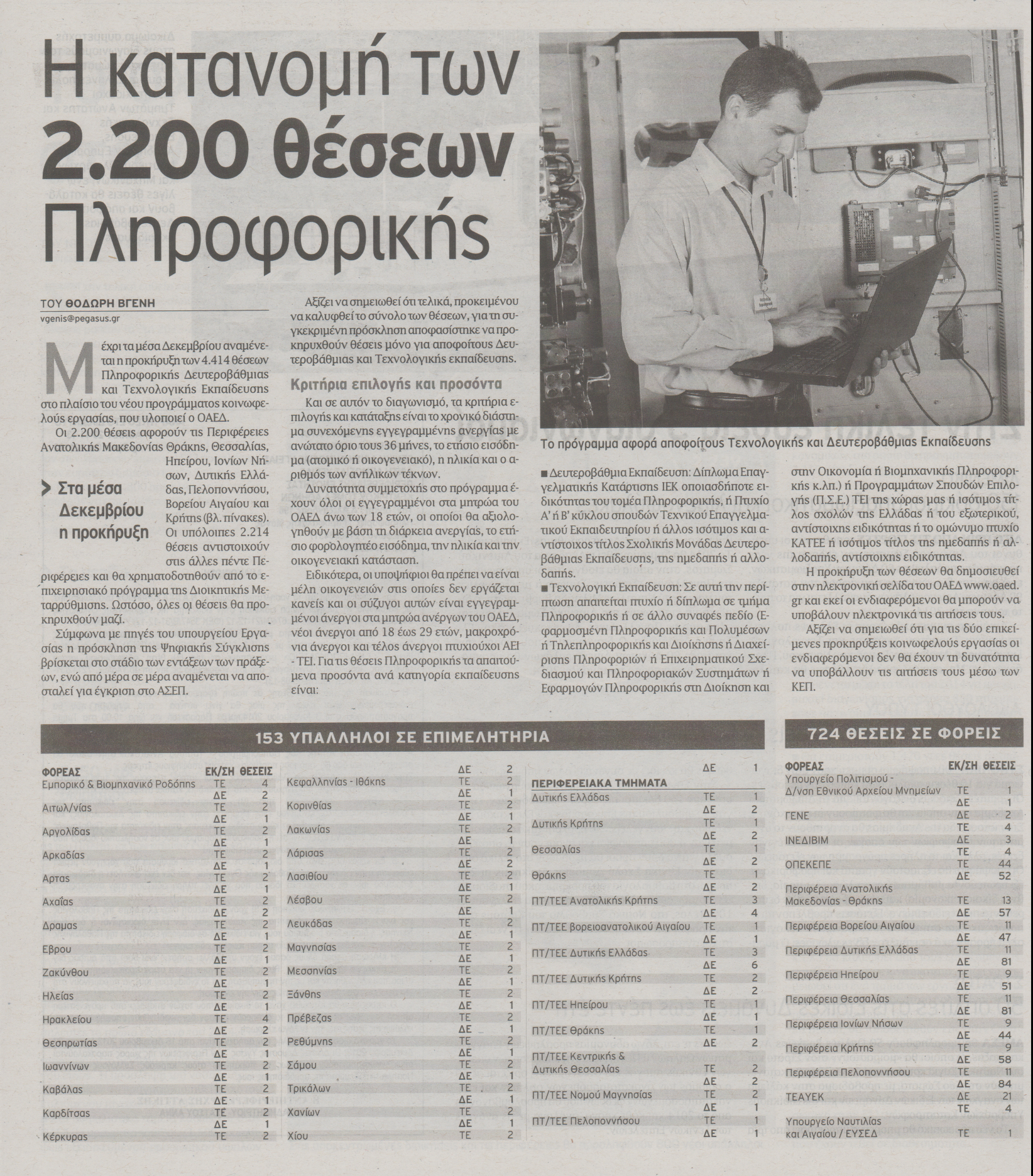 Η κατανομή των 2.200 θέσεων πληροφορικής