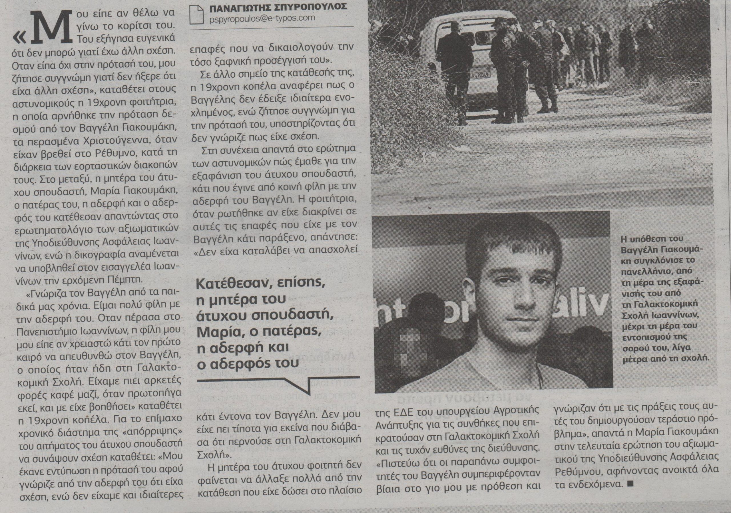 Στο μεταξύ η μητέρα του άτυχου σπουδαστή, Μαρία Γιακουμάκη, ο πατέρας του, η αδερφή και ο αδερφός του κατέθεσαν απαντώντας στο ερωτηματολόγιο των αξιωματικών της Υποδιεύθυνσης Ασφάλειας Ιωαννίνων, ενώ η δικογραφία αναμένεται να υποβληθεί στον εισαγγελέα Ιωαννίνων την ερχόμενη Πέμπτη.