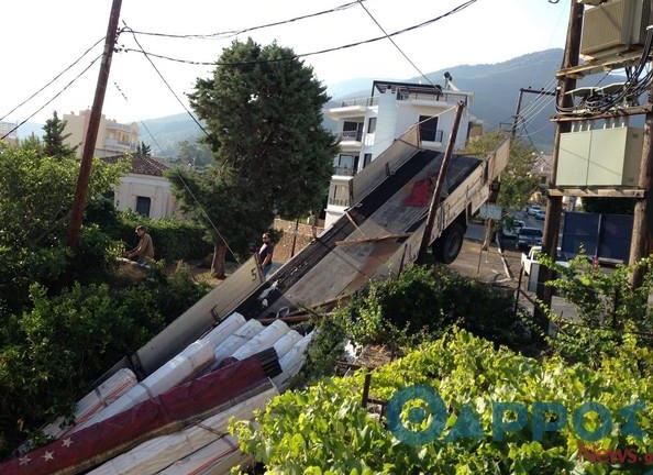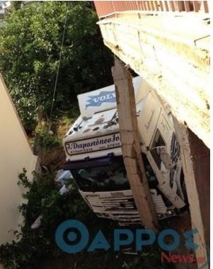 Τελικά η τεραστίων διαστάσεων νταλίκα αφού «κύλησε» στον κατηφορικό δρόμο και προσέκρουσε σε τρία τουλάχιστον αυτοκίνητα, έπεσε σε αυλή σπιτιού, δεξιά του δρόμου και σταμάτησε την πορεία της στην κολώνα μπαλκονιού του σπιτιού λίγα μόλις μέτρα πριν προσκρούσει και σε άλλο σπίτι.