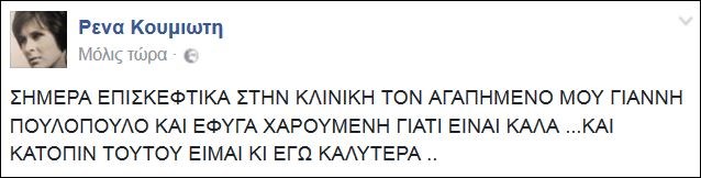Είναι γνωστή η φιλία που συνδέει την Ρένα Κουμιώτη με τον Γιάννη Πουλόπουλο. Με ανάρτησή της στο Facebook, η γνωστή τραγουδίστρια έκανε γνωστό ότι επισκέφθηκε τον 76χρονο αγαπημένο καλλιτέχνη στο νοσοκομείο και ότι η κατάσταση της υγείας του είναι καλή. Όπως είναι γνωστό ο δημοφιλής τραγουδιστής νοσηλεύεται στην εντατική του νοσοκομείου «Ελπίς», καθώς υποβλήθηκε σε αγγειοπλαστική.Αναλυτικά το σχόλιο της κ. Κουμιώτη:«Σήμερα επισκέφθηκα στην κλινική τον αγαπημένο μου Γιάννη Πουλόπουλο και έφυγα χαρούμενη γιατί είναι καλά. Και κατόπιν τούτου είμαι και εγώ καλύτερα».
