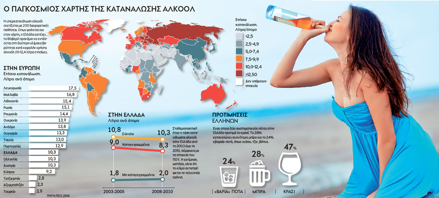 Βαρείς και συστηματικούς πότες εξακολουθεί να έχει η Ελλάδα. Η χώρα μας κατατάσσεται από τον Παγκόσμιο Οργανισμό Υγείας (ΠΟΥ) στη δεύτερη ζώνη σε βαρύτητα κατανάλωσης οινοπνεύματος, ξεπερνώντας χώρες όπως οι ΗΠΑ!