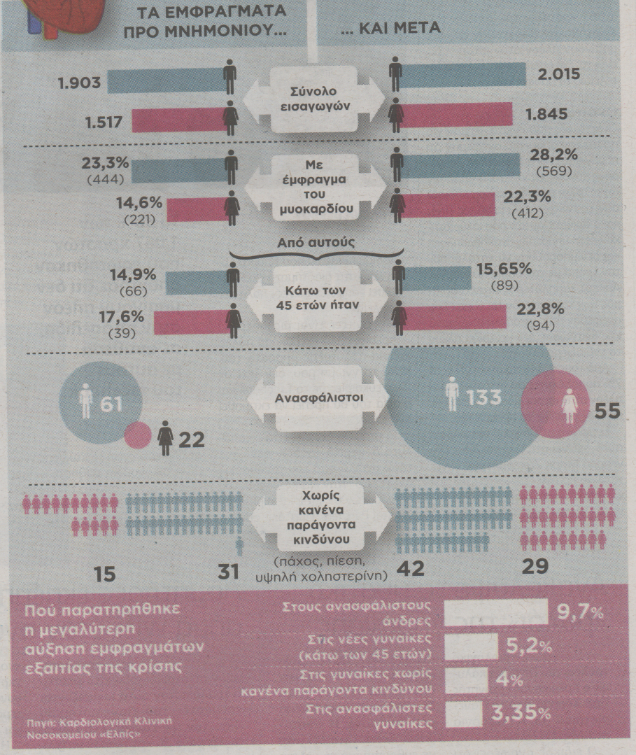 Τα ευρήματα της μελέτης που συγκρίνει τα χρόνια, πριν και μετά την οικονομική κρίση στην πατρίδα μας, δείχνουν, επίσης πως αυξήθηκαν τα εμφράγματα του μυοκαρδίου στις νέες γυναίκες κάτω των 45 ετών, που παραδοσιακά θεωρούνταν αλώβητες από τις καρδιοπάθειες και στους ανασφάλιστους-άνδρες και γυναίκες- οι οποίοι φαίνεται πως πληρώνουν το βαρύτερο τίμημα, επιβεβαιώνοντας το σοφό λαϊκό ρητό «όπου φτωχός (και ανασφάλιστος) και η μοίρα του…».