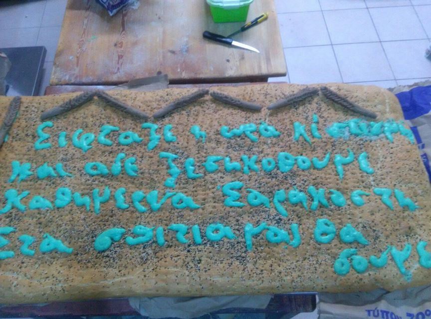 Ο φούρναρης έγραψε μάλιστα και μια μαντινάδα πάνω στη λαγάνα στέλνοντας το δικό του μήνυμα: «’Ειφταξε η ώρα και η στιγμή και αδε ξεσηκωθούμε καθημερνά Σαρακοστή στα σπίτια μας θα δούμε»