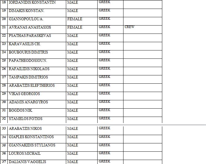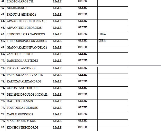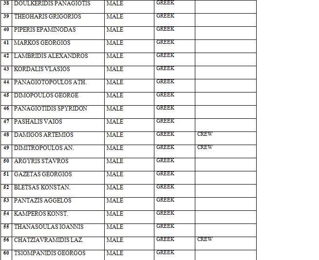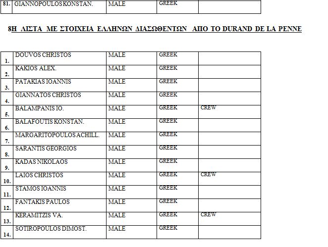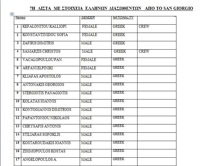 Πατήστε εδώ για να δείτε τη λίστα με τα στοιχεία των Ελλήνων διασωθέντων, επιβατών και πληρώματος, του Ε/Γ-Ο/Γ “Norman Atlantic”, όπως επίσημα διαβιβάστηκαν από τους πλοιάρχους των πλοίων “San Giorgio” και “Durand de la penne” στο Ενιαίο Κέντρο Συντονισμού Έρευνας και Διάσωσης του Α.Λ.Σ-ΕΛ.ΑΚΤ. Όλοι οι επιβαίνοντες παραμένουν ασφαλείς στα δύο πλοία.