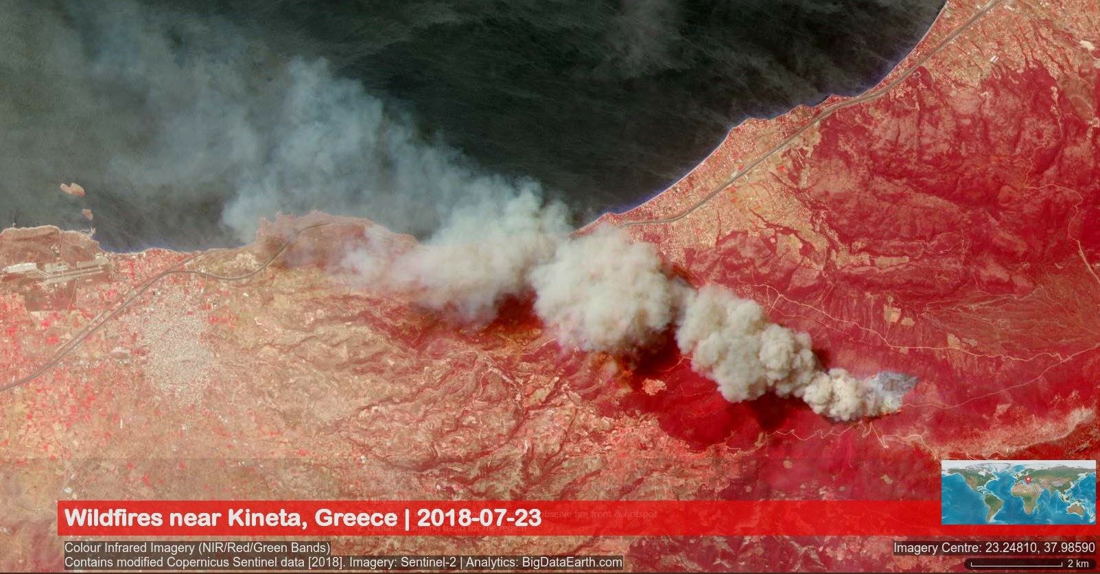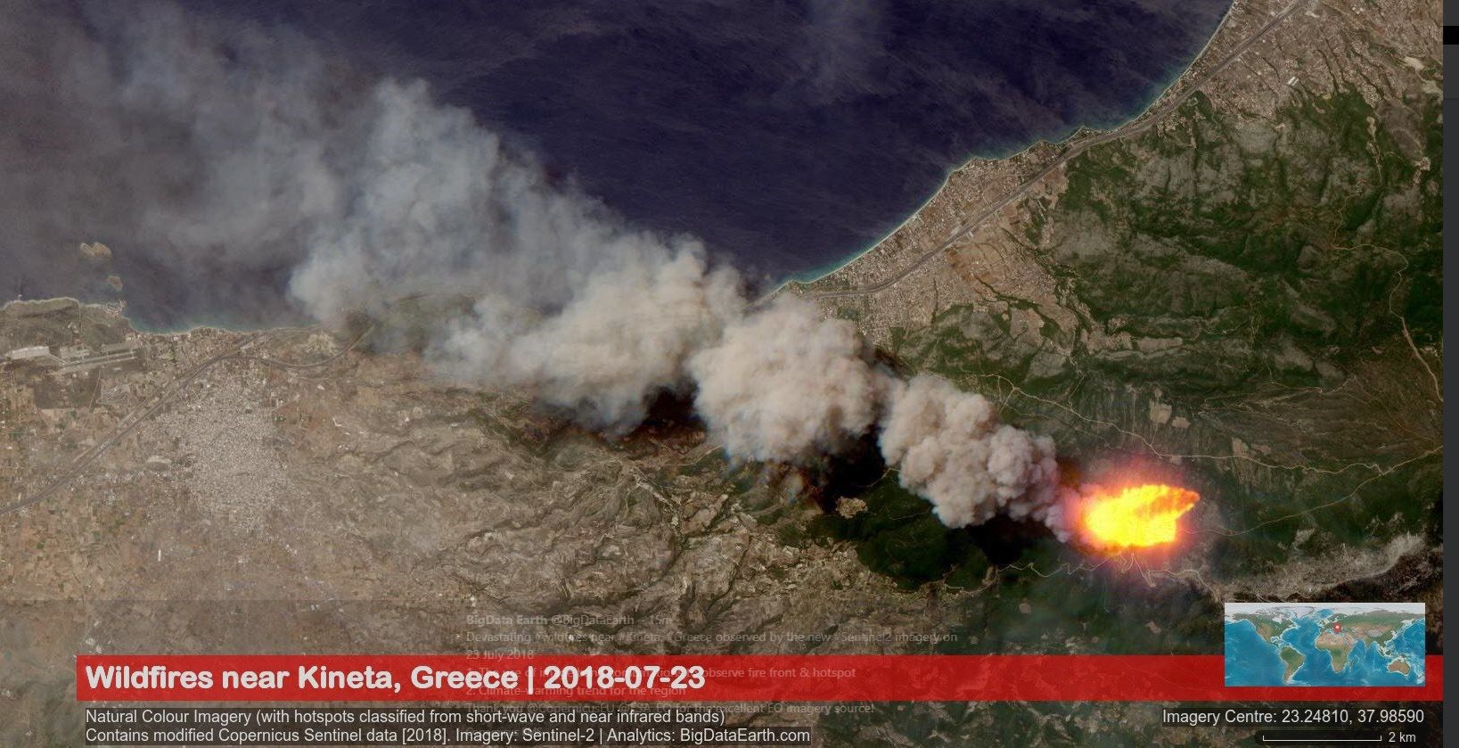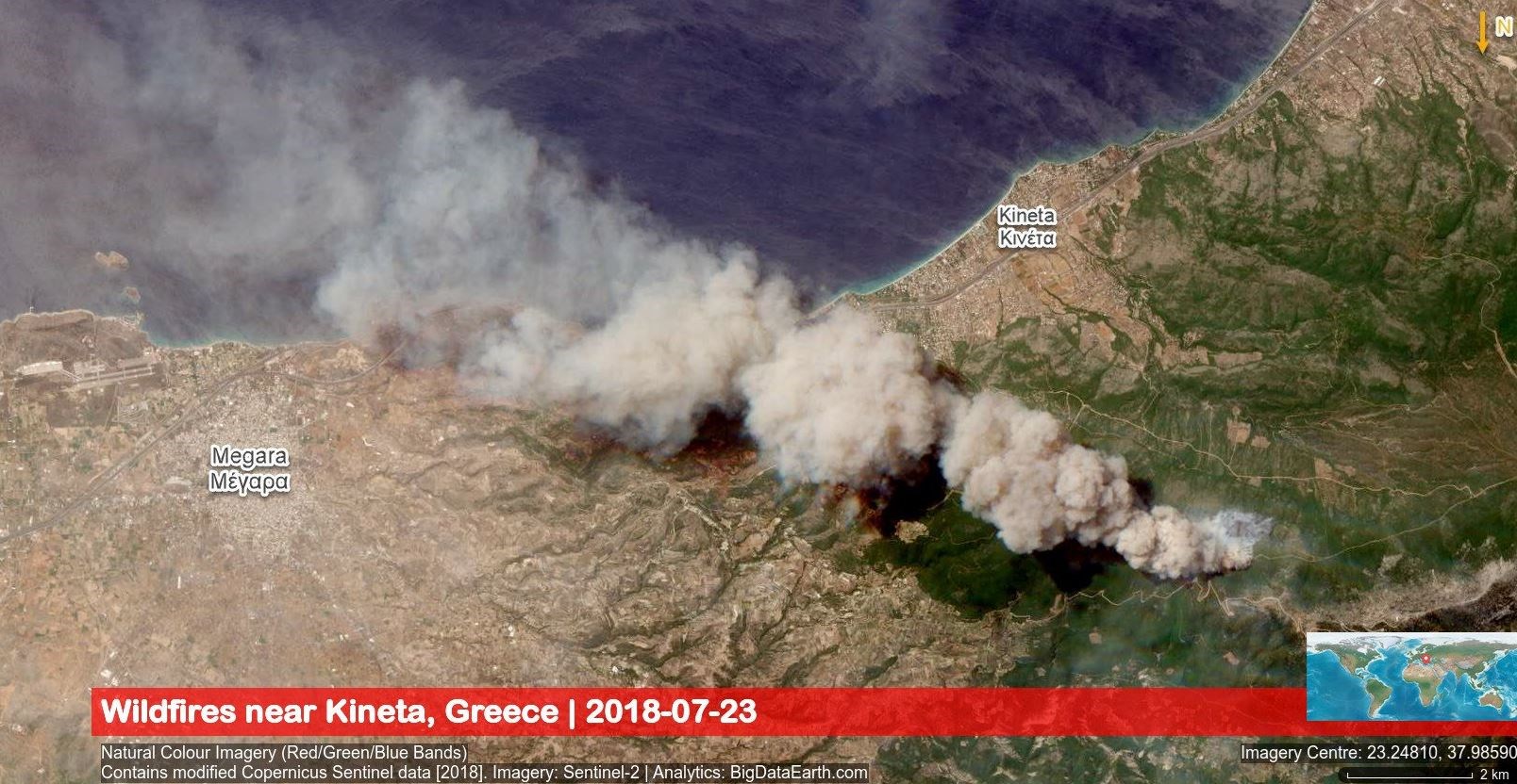 Δορυφορικές εικόνες από την πυρκαγιά στην Κινέτα έδωσε στη δημοσιότητα η ευρωπαϊκή υπηρεσία Copernicus που καταγράφει καιρικά φαινόμενα και καταστροφές στην ευρωπαϊκή ήπειρο από το διάστημα.
