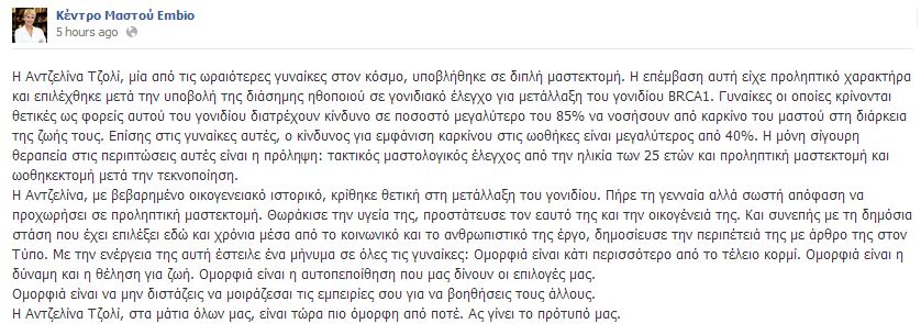 Η εξομολόγηση της Αντζελίνας Τζολί για την διπλή μαστεκτομή στην οποία υπεβλήθη δεν άφησε ασυγκίνητη την Νατάσα Καραμανλή η οποία έγραψε: «Στα μάτια όλων μας, είναι τώρα πιο όμορφη από ποτέ. Ας γίνει το πρότυπό μας».