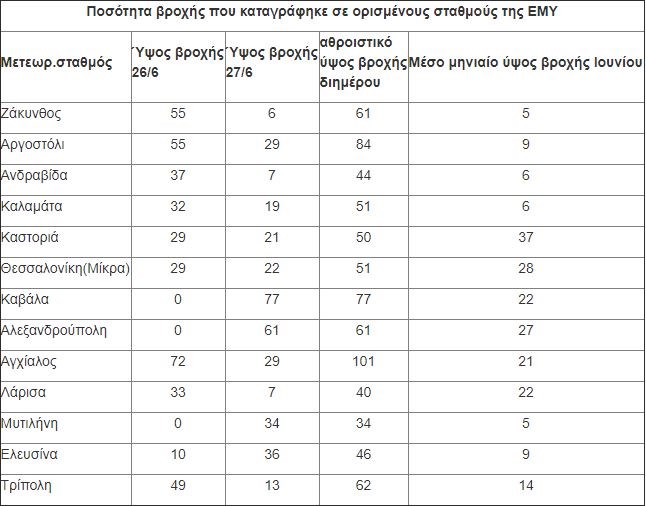α. Στον πίνακα δίνεται για ορισμένους σταθμούς του δικτύου της ΕΜΥ το ύψος της βροχής σε χιλιοστά που κατέγραψαν οι παρατηρητές για το διήμερο 26/6-27/6. Ταυτόχρονα, δίνεται και το μέσο μηνιαίο ύψος βροχής για όλο τον Ιούνιο όπως έχει υπολογιστεί για τους σταθμούς αυτούς σε διάρκεια μεγαλύτερη των 30 ετών. Τα στοιχεία υπάρχουν διαθέσιμα στον κλιματικό άτλαντα της Εθνικής Μετεωρολογικής Υπηρεσίας.