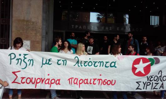 Παρέμβαση πραγματοποίησε πριν από λίγη ώρα η νεολαία του ΣΥΡΙΖΑ, έξω από την Τράπεζα της Ελλάδος, με κεντρικό σύνθημα «Ρήξη με την λιτότητα» και «Στουρνάρα παραιτήσου».