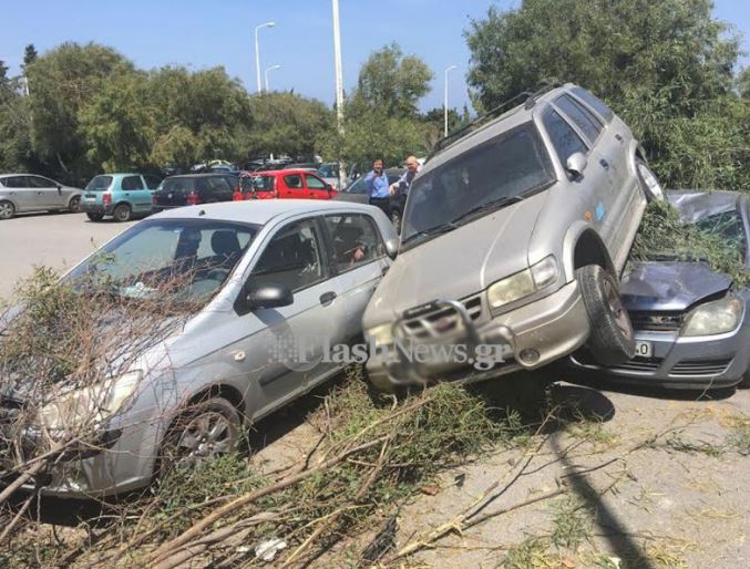 Σύμφωνα με το flashnews.gr η οδηγός του οχήματος, για άγνωστο λόγο, έχασε τον έλεγχό του και αφού παρέσυρε ένα μικρό δέντρο, πέρασε πάνω από ένα σταθμευμένο ΙΧ, μέσα στο οποίο ευτυχώς δεν υπήρχαν επιβάτες.
