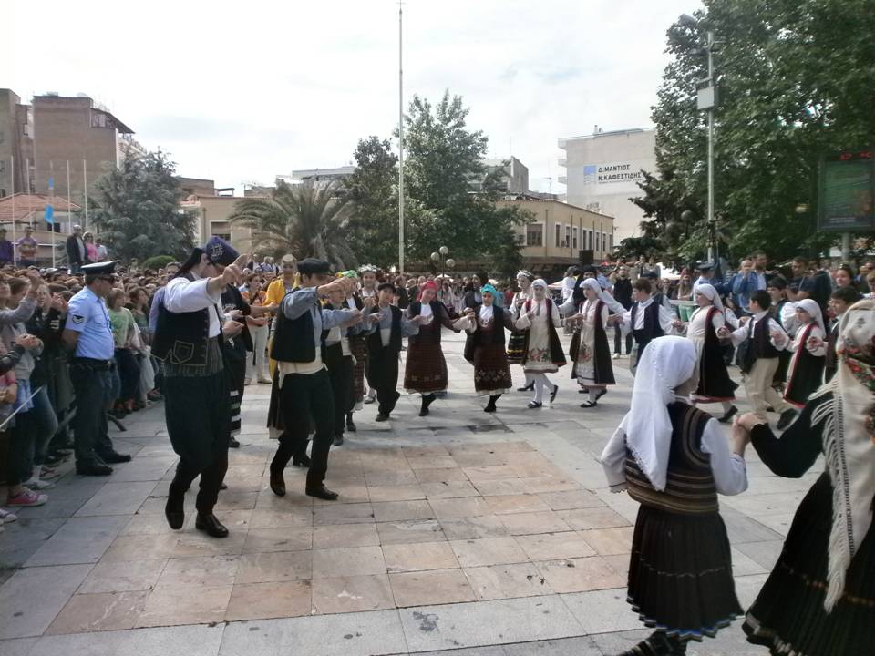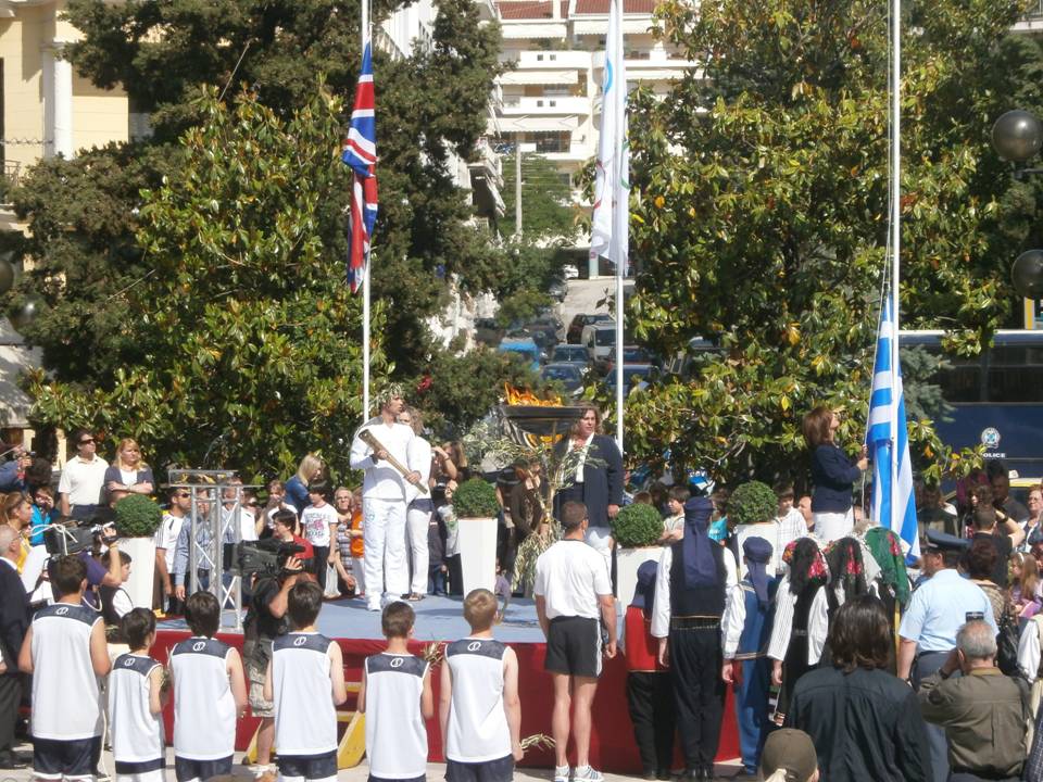 Με το πέρας της τελετής υποδοχής, τη δάδα άναψε ο ολυμπιονίκης της πάλης, Απόστολος Τασκούδης, ο οποίος και κατηφόρισε προς την οδό Μεραρχίας όπου και την παρέδωσε στον παγκόσμιο πρωταθλητή του Ταε κβο ντο, Δημήτρη Δαύτσιο. Αυτός με τη σειρά του παρέδωσε στον παγκόσμιο πρωταθλητή Στίβου, Σπύρο Παπαδόπουλο, ο οποίος την παρέδωσε στον παγκόσμιο πρωταθλητή και ολυμπιονίκη των Special Olympics, Βαγγέλη Ακόνη, τελευταίο λαμπαδηδρόμο στην οδό Μεραρχίας, μέχρι το ύψος της Πυροσβεστικής Υπηρεσίας, απ’ όπου θα μεταφερθεί με όχημα στην πόλη της Κατερίνης. Γιάννης Δελής