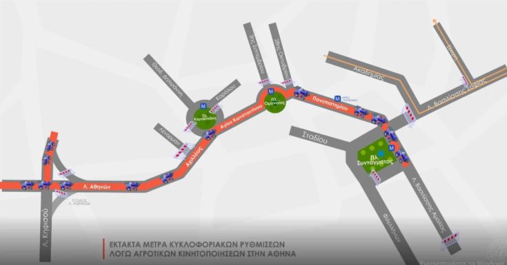 - Προσωρινή διακοπή της κυκλοφορίας κατά μήκος του δρομολογίου που θα ακολουθήσουν τα αγροτικά οχήματα: Λεωφόρος Αθηνών, Αχιλλέως, πλατεία Καραϊσκάκη. Θα κινηθούν αντίθετα στην οδό Αγίου Κωνσταντίνου, την πλατεία Ομονοίας και την οδό Πανεπιστημίου, προκειμένου να φθάσουν στο Σύνταγμα. Θα υπάρξει προσωρινή διακοπή της κυκλοφορίας πέριξ της πλατείας Ομονοίας.