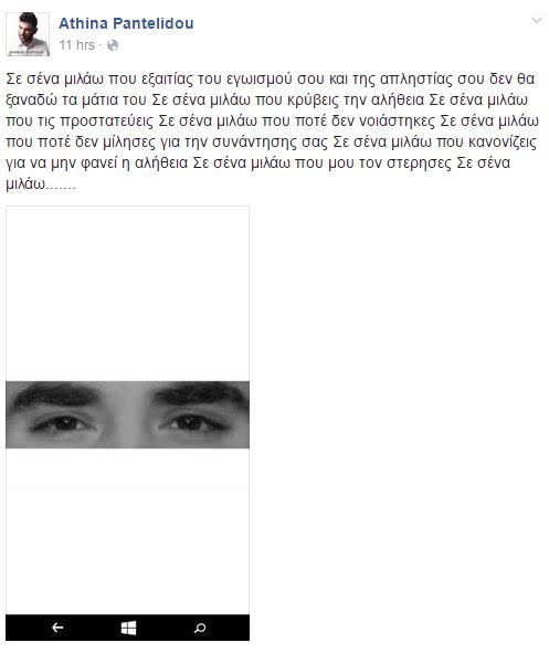 «Σε σένα μιλάω που εξαιτίας του εγωισμού σου και της απληστίας σου δεν θα ξαναδώ τα μάτια του Σε σένα μιλάω που κρύβεις την αλήθεια Σε σένα μιλάω που τις προστατεύεις Σε σένα μιλάω που ποτέ δεν νοιάστηκες Σε σένα μιλάω που ποτέ δεν μίλησες για την συνάντησης σας Σε σένα μιλάω που κανονίζεις για να μην φανεί η αλήθεια Σε σένα μιλάω που μου τον στέρησες Σε σένα μιλάω……»