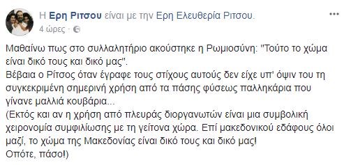 «Ο Ρίτσος όταν έγραφε τους στίχους αυτούς δεν είχε υπ’ όψιν του τη συγκεκριμένη σημερινή χρήση από τα πάσης φύσεως παλληκάρια που γίνανε μαλλιά κουβάρια…», αναφέρει χαρακτηριστικά σε ανάρτησή της στο Facebook, η κόρη του Γιάννη Ρίτσου, Έρη, η οποία αντέδρασε με τον τρόπο αυτό στην χρήση της “Ρωμιοσύνης” από τους διοργανωτές του συλλαλητηρίου.