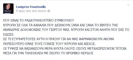 Λίγες ώρες νωρίτερα, ο Λάμπρος Φουντούλης ξέσπασε και μέσω Facebook, κάνοντας λόγο για ντροπή και επιρρίπτοντας εμμέσως πλην σαφώς ευθύνες στο ΕΣΡ που επιτρέπει την προβολή σχετικών βίντεο: