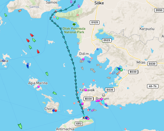 Η πρώτη φωτογραφία δείχνει ότι όλη η πορεία του τουρκικού πλοίου, πριν πλησιάσει την Κω και προσαράξει, είναι σχεδόν όλη μέσα στα τουρκικά χωρικά ύδατα.