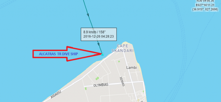 Στην δεύτερη φωτογραφία που το Alcatras βρίσκεται λίγο πριν το σημείο της προσάραξης του, έχει πορεία 158 και ταχύτητα 8,9 κόμβους.