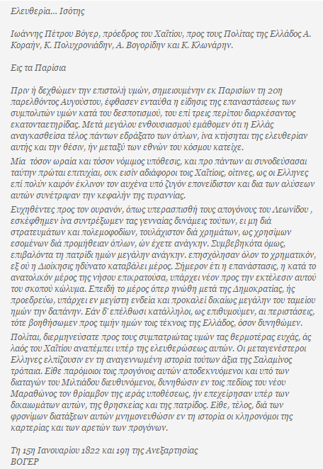 Η Αϊτή -το Χαΐτιον, σύμφωνα με τα ελληνικά της εποχής- ήταν η πρώτη κρατική οντότητα που αναγνώρισε την Επανάσταση του ’21 και το δικαίωμα των Ελλήνων για αυτοδιάθεση, με την επιστολή του προέδρου της Ιωάννου Βόγιερ (Jean Pierre Boyer) προς τον Αδαμάντιο Κοραή, η οποία φέρει ημερομηνία 15 Ιανουαρίου 1822.